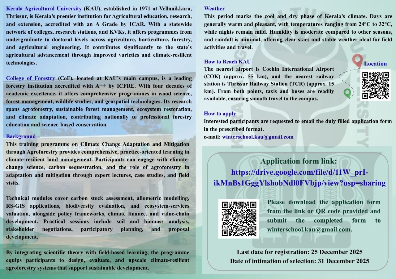 Notification Issued From: Kerala Agricultural UniversityDate of Reference Document: Friday, December 5, 2025Event Date: Wednesday, January 21, 2026 to Tuesday, February 10, 2026 brochure_1.jpg brochure_2.jpg Documents: icar_winterschool_brochure_kau.pdf
