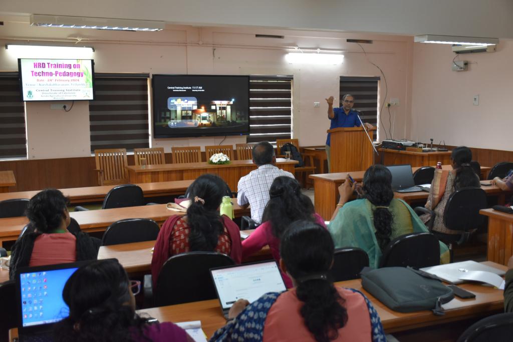 HRD Training for KAU scientists on "Techno Pedagogy" was conducted on 24th February 2024. The programme was inaugurated by Dr Helen S, Professor & Head,CTI. Dr. Ashkarali P. handled the session. Dr. Mridula N, Assistant Professor, co-ordinated the programme.