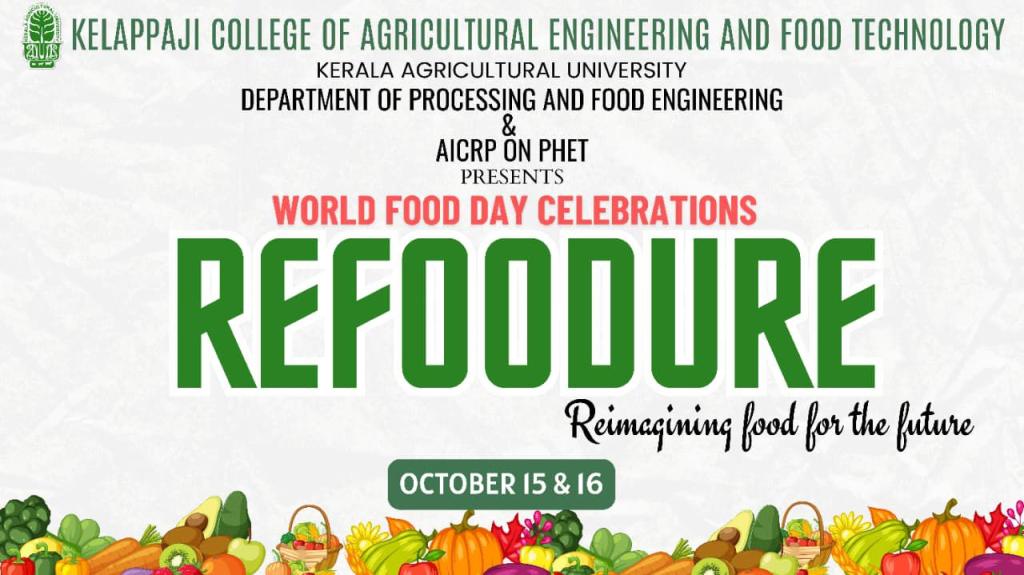 The Department of Processing and Food Engineering, in collaboration with AICRP on PHET, organized a two-day programme titled “ReFoodure: Reimagining Food for Future” on October 15–16, 2025, to mark World Food Day. The event, aligned with the global theme “Hand in Hand for Better Food and a Better Future,” was inaugurated by the Dean, Faculty of Agricultural Engineering. Dr. Deepak Mathew, Professor (Cattle Breeding), KVASU, and other dignitaries graced the occasion. A special talk by Dr. Swathy V., M.D. (Ayurveda) on “Healthy Diet, Healthy Living” drew great appreciation. The celebration featured engaging student events such as quiz, poster making, food vlogging, photography, and sustainable cooking competitions, showcasing creativity and enthusiasm.