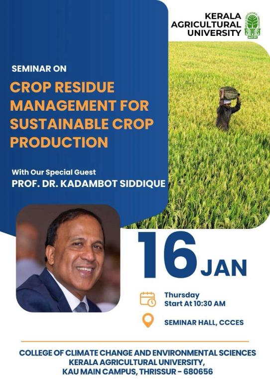 A seminar on "Crop Residue Management for Sustainable Crop Production" was held on 16th January 2025 at the CCCES Seminar Hall, Kerala Agricultural University (KAU). The event featured an enlightening keynote address by Prof. Dr. Kadambot Siddique.